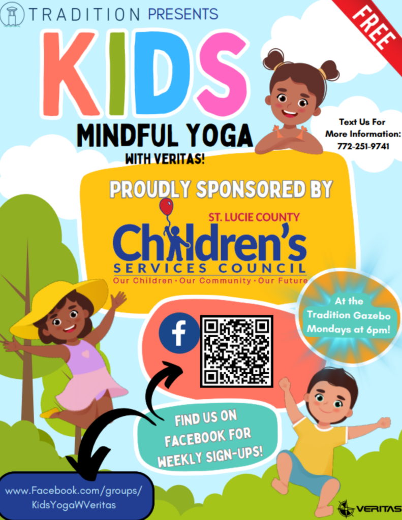 Join Veritas for a Kid’s Mindful Yoga Class each Monday at the Gazebo from 6PM-7PM!