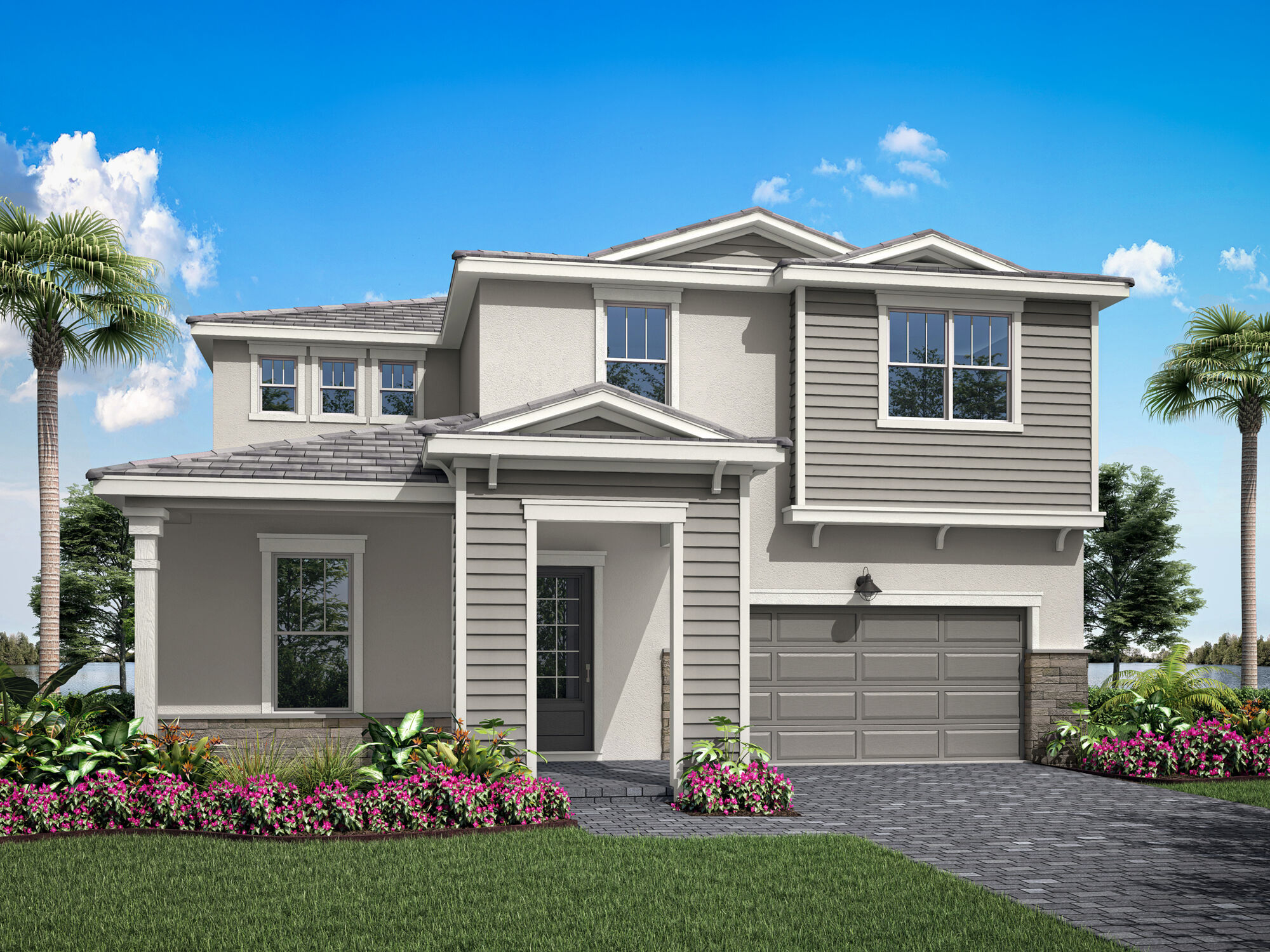 The Eau is a 2,585 sq. ft. 2-story home that offers 3 bedrooms, 2.5 baths and 2-car garage. Upon entering the foyer, you are welcomed to an open floorplan. The spacious kitchen offers an extensive walk-in pantry and an island breakfast bar. The kitchen overlooks the dining area and Great Room. A sliding glass door in the Dining Room leads to the covered lanai. The second floor is complete with a loft, owners suite and bath, two additional bedrooms and a full bath. The roomy loft offers a flexible living space. The owners suite boasts a large walk-in closet and is connected to the owners bath with a spacious shower and dual sink raised vanity. All of the secondary bedrooms have walk-in closets and share a full bath with double sinks. The laundry room is located upstairs for added convenience.